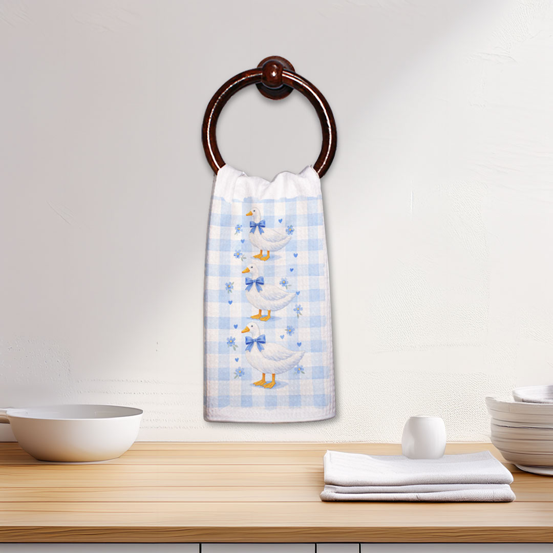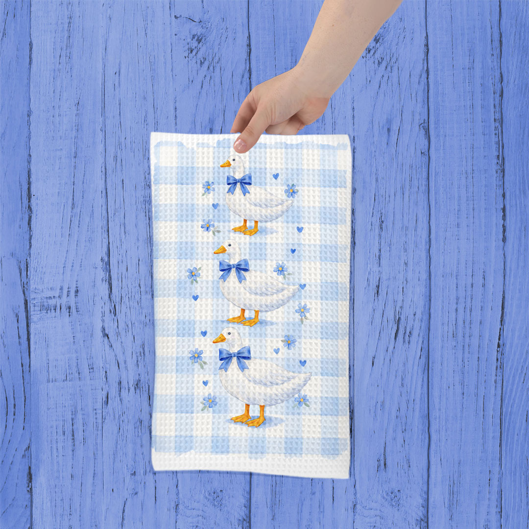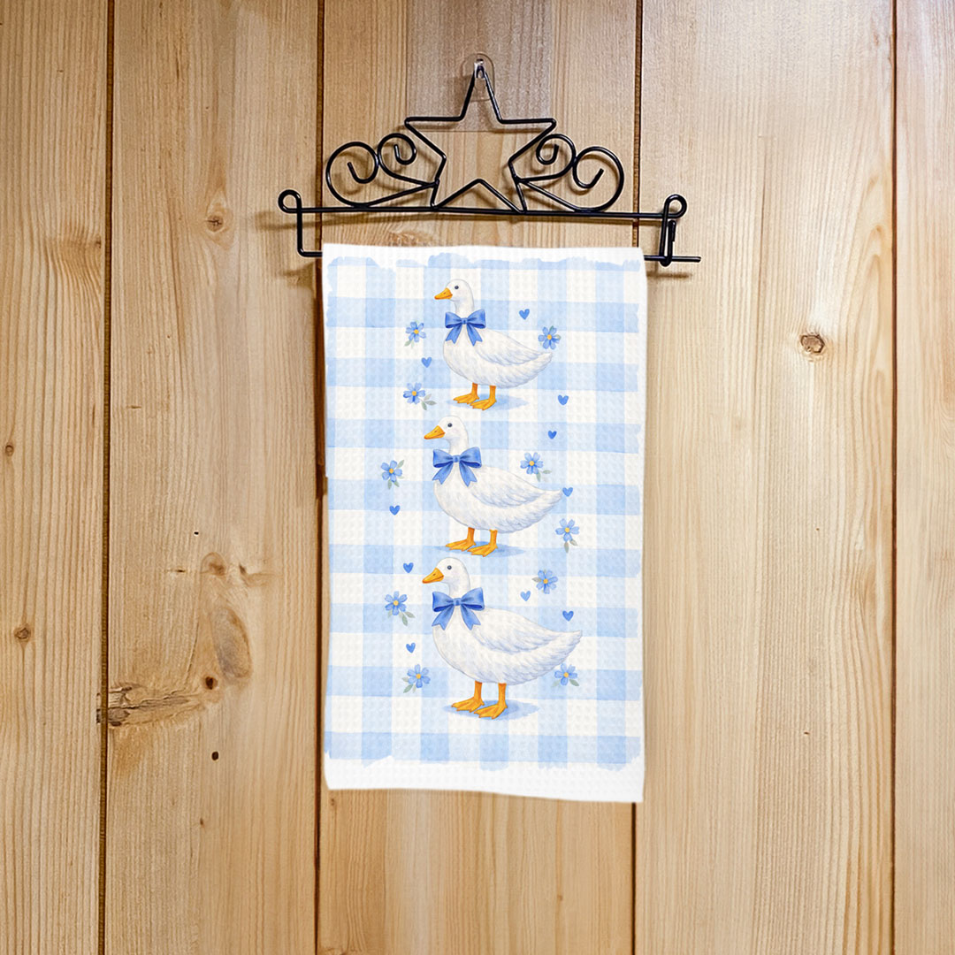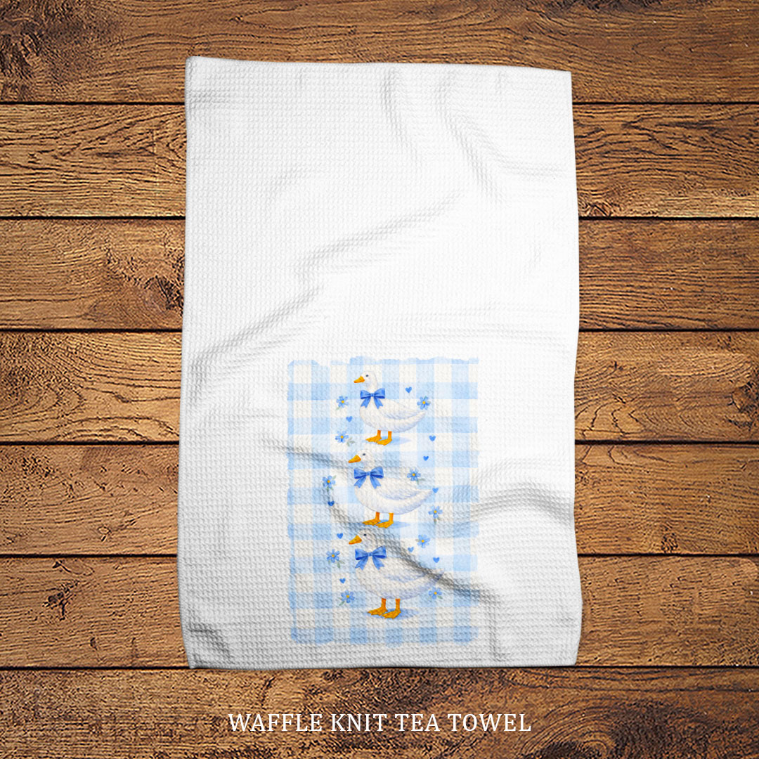 Add a touch of charm and vintage farmhouse style to your kitchen with this Goose Kitchen Collection tea towel. Featuring three watercolor geese with soft blue bows on a delicate blue gingham background, this design brings a cozy, cottage-inspired feel to your home.