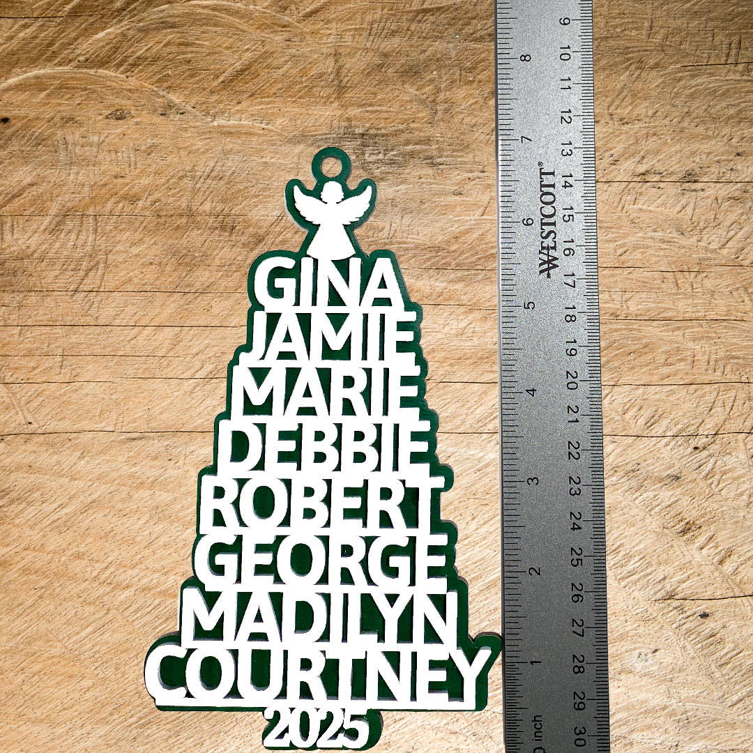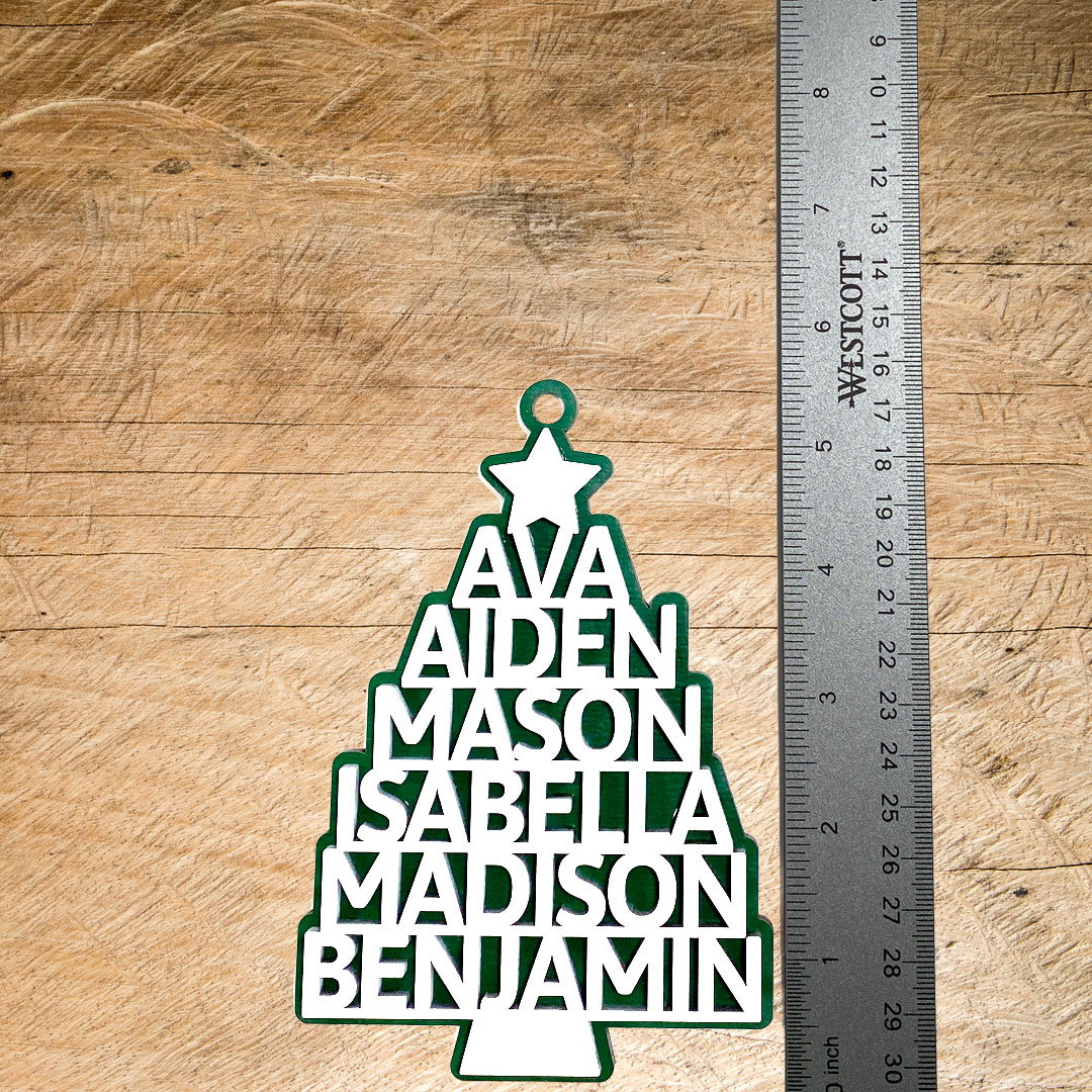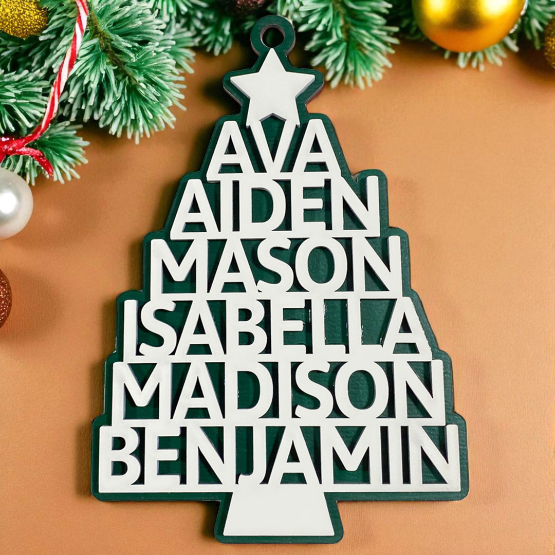 This ornament features a delightful tree-shaped design made from MDF and wood. It is precisely laser cut to ensure both accuracy and durability. This type of ornament makes an ideal gift, particularly for families or community groups. You can personalize it with your family names (including pets!) to turn it into a treasured keepsake for many years. Share happiness and warmth this season with this charming ornament. You can add up to 10 names. The names will be arranged from shortest to longest, top to bottom, and designed for the best appearance by our designer. The size will vary depending on the number of names.
