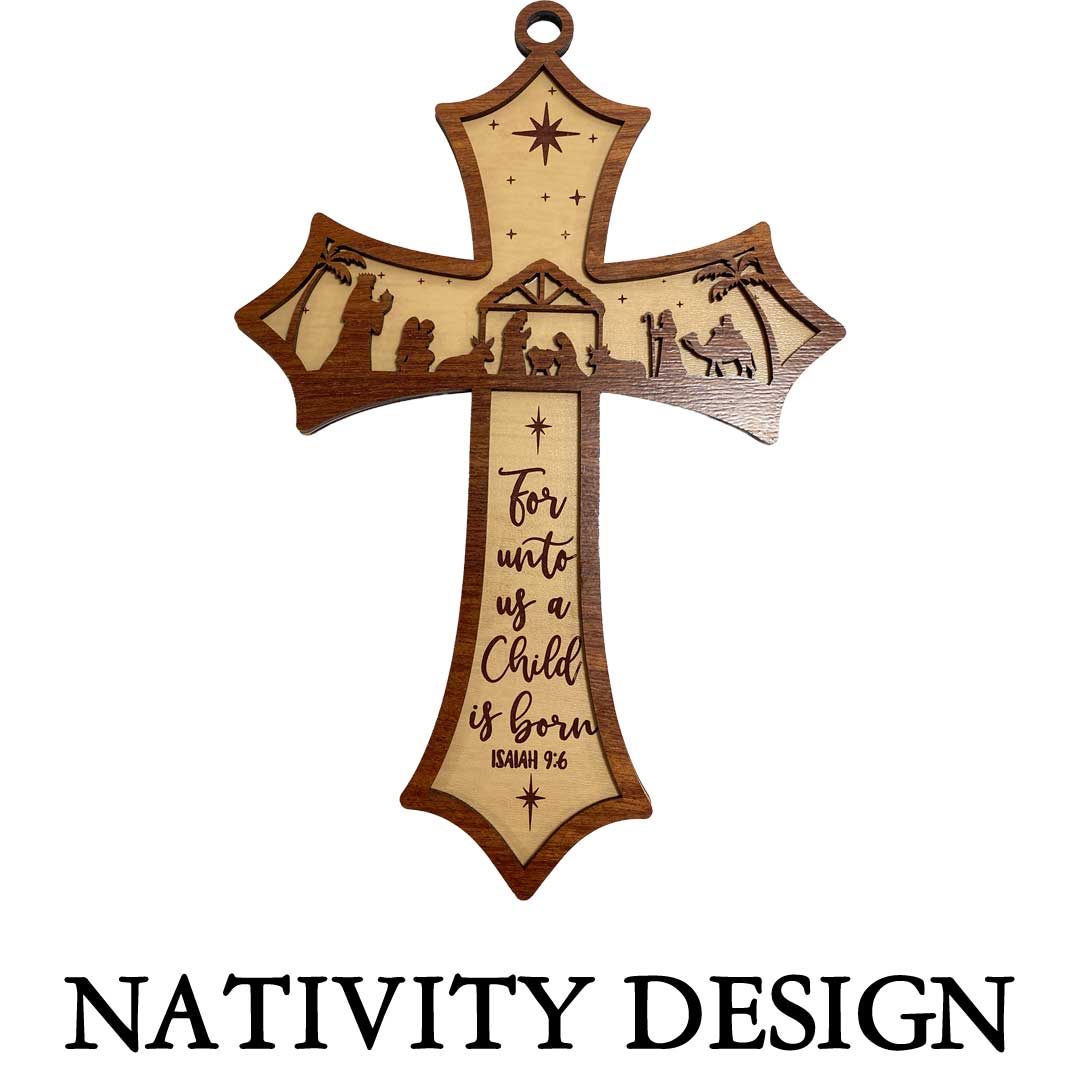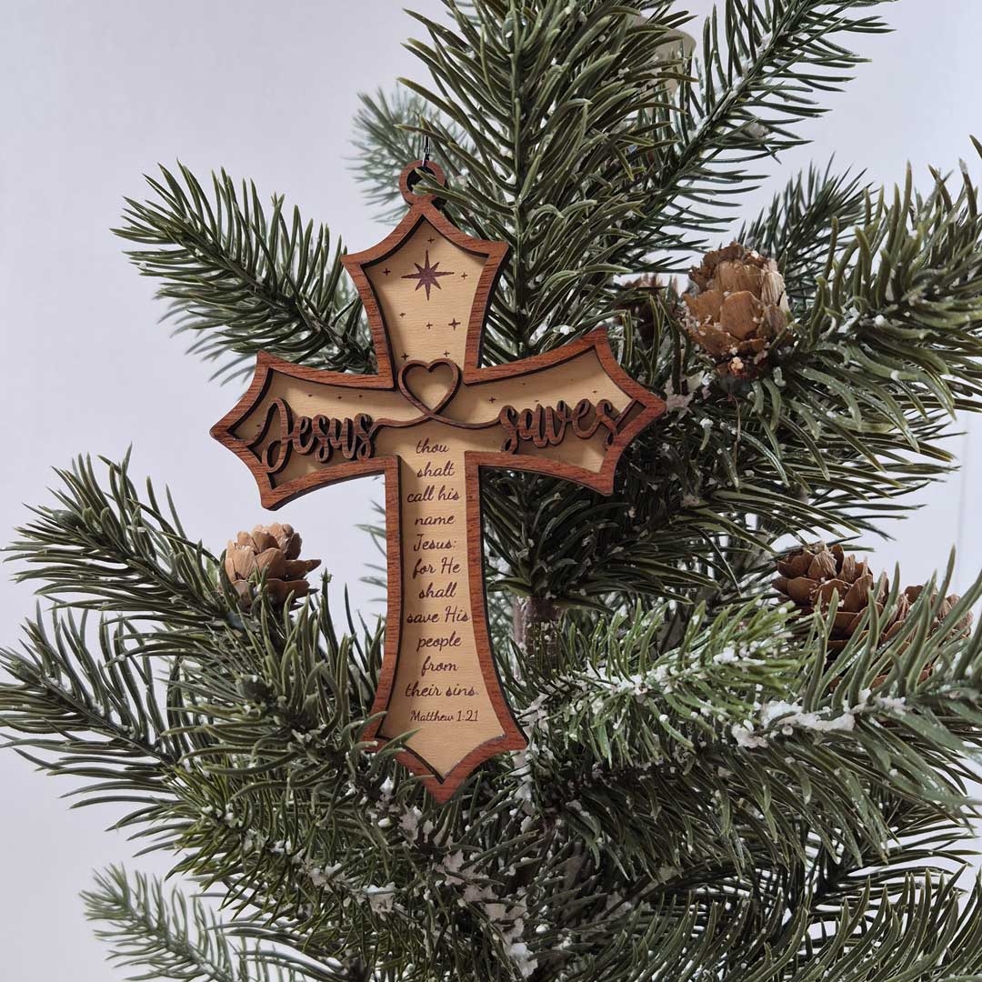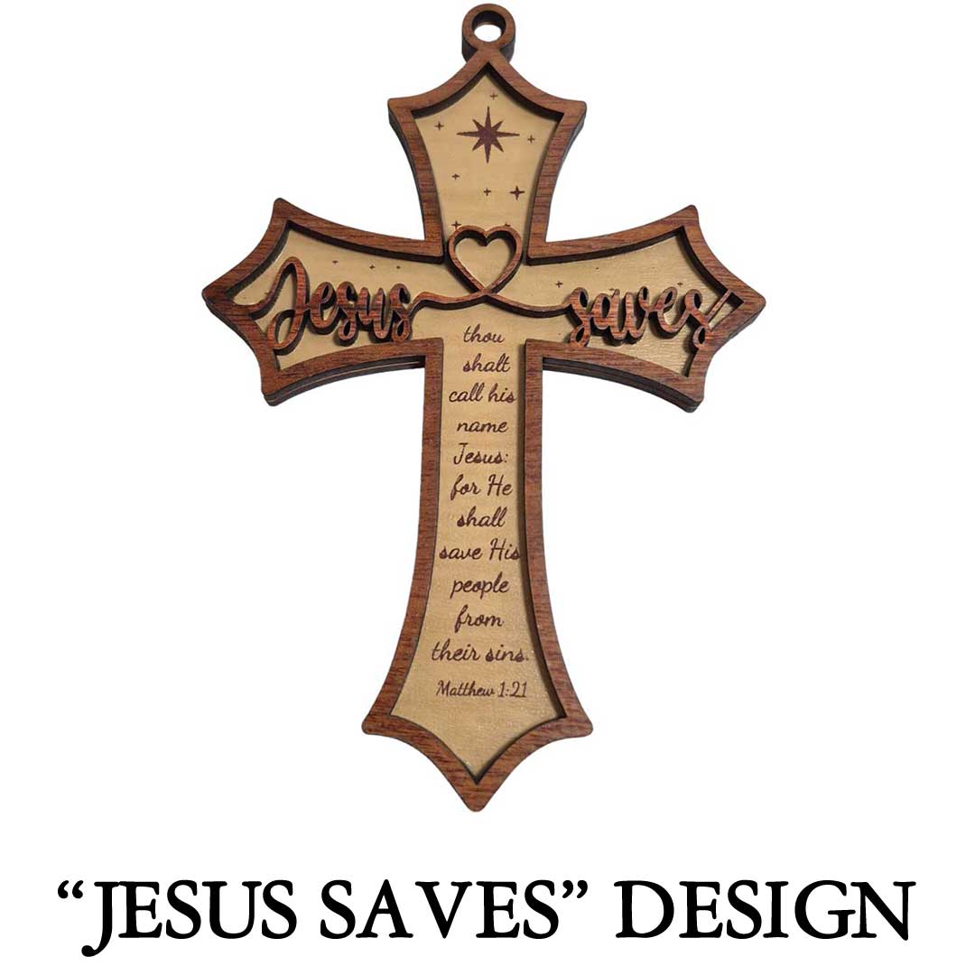 Celebrate the true meaning of Christmas with this handcrafted, two-layer wooden cross ornament featuring a beautifully detailed nativity scene or a flowing “Jesus Saves” inscription which is across the horizontal arms of the cross, and joined by a heart motif at the center and a star above—symbolizing divine love and guidance. Your choice of design below.